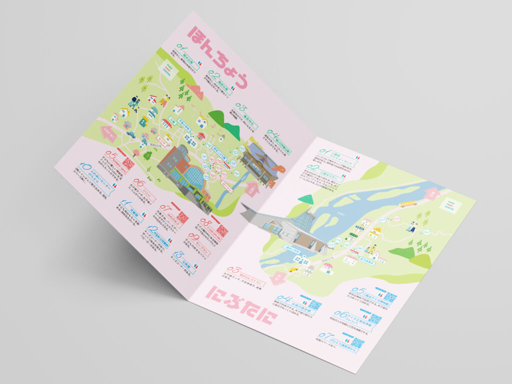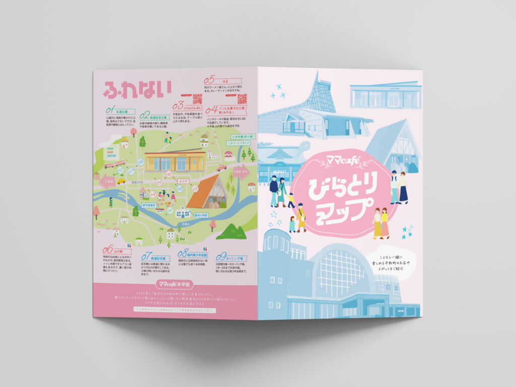 平取町で子育てを応援する「ママcafé」さまより、親子で利用しやすい店舗や公園をまとめたマップリーフレットのご依頼をいただきました。掲載店舗は「子ども連れでも入りやすいこと」を基準にセレクト。保護者が安心して利用できるよう、トイレの有無も明記し、実用性を高めています。